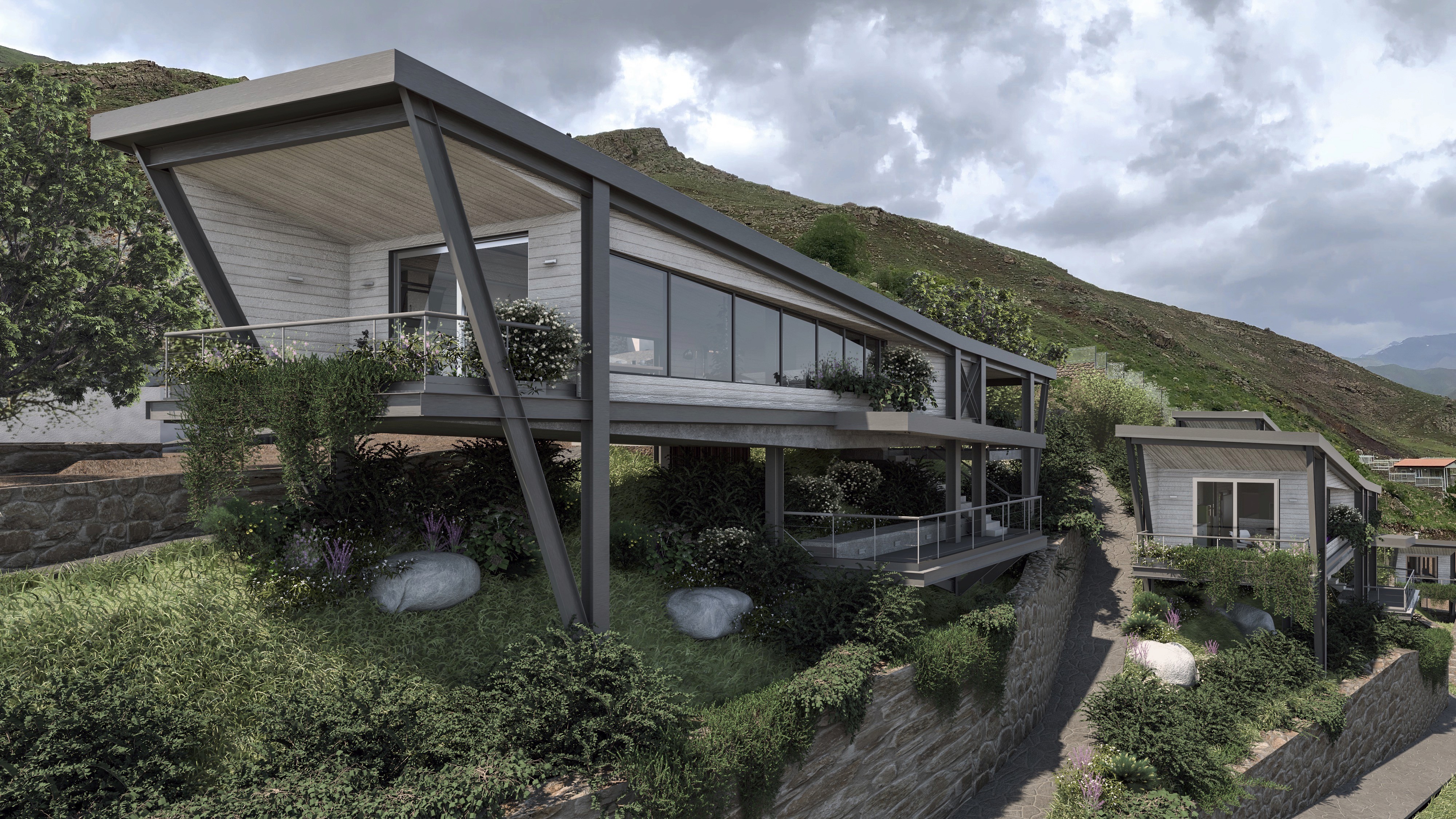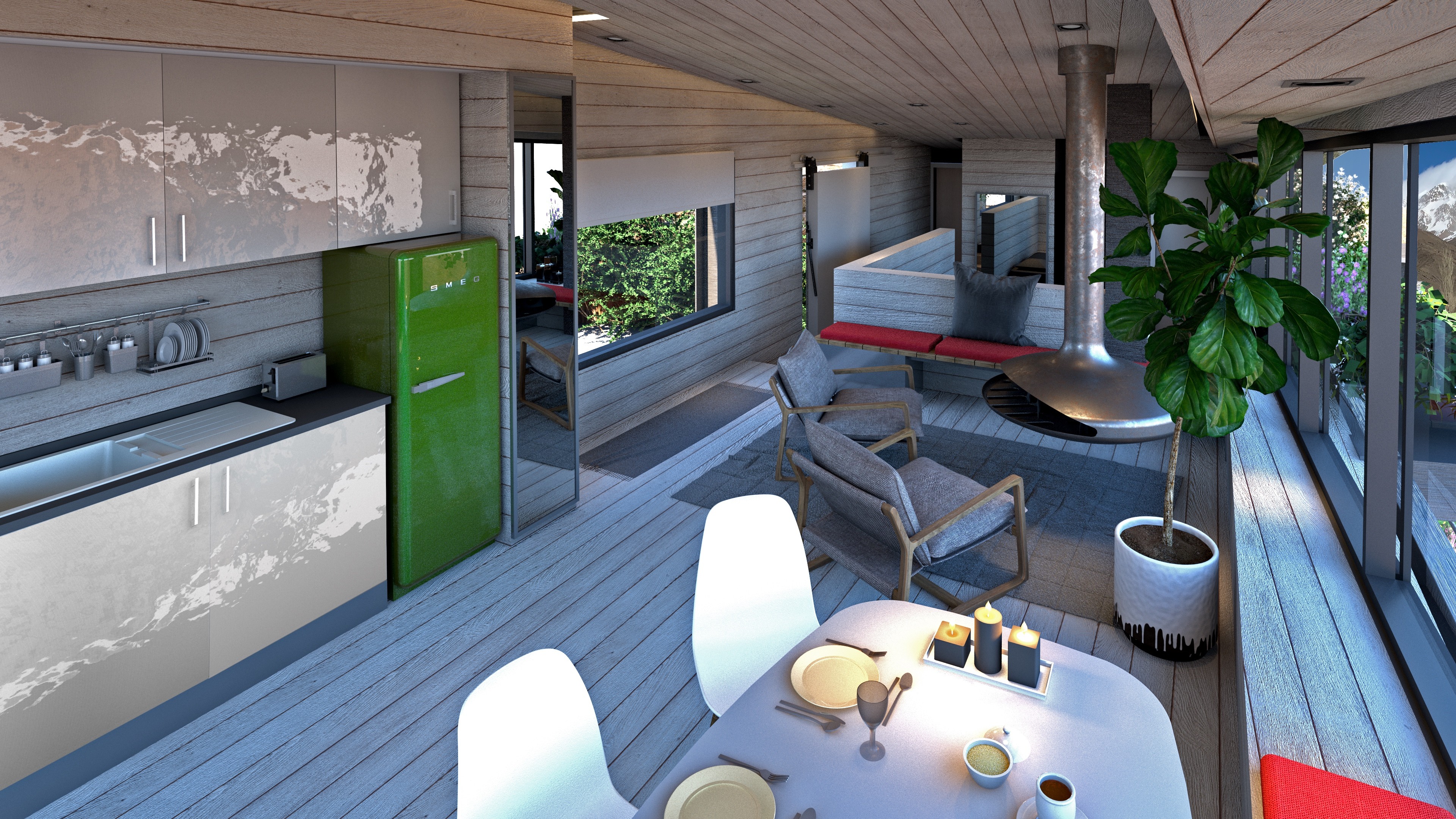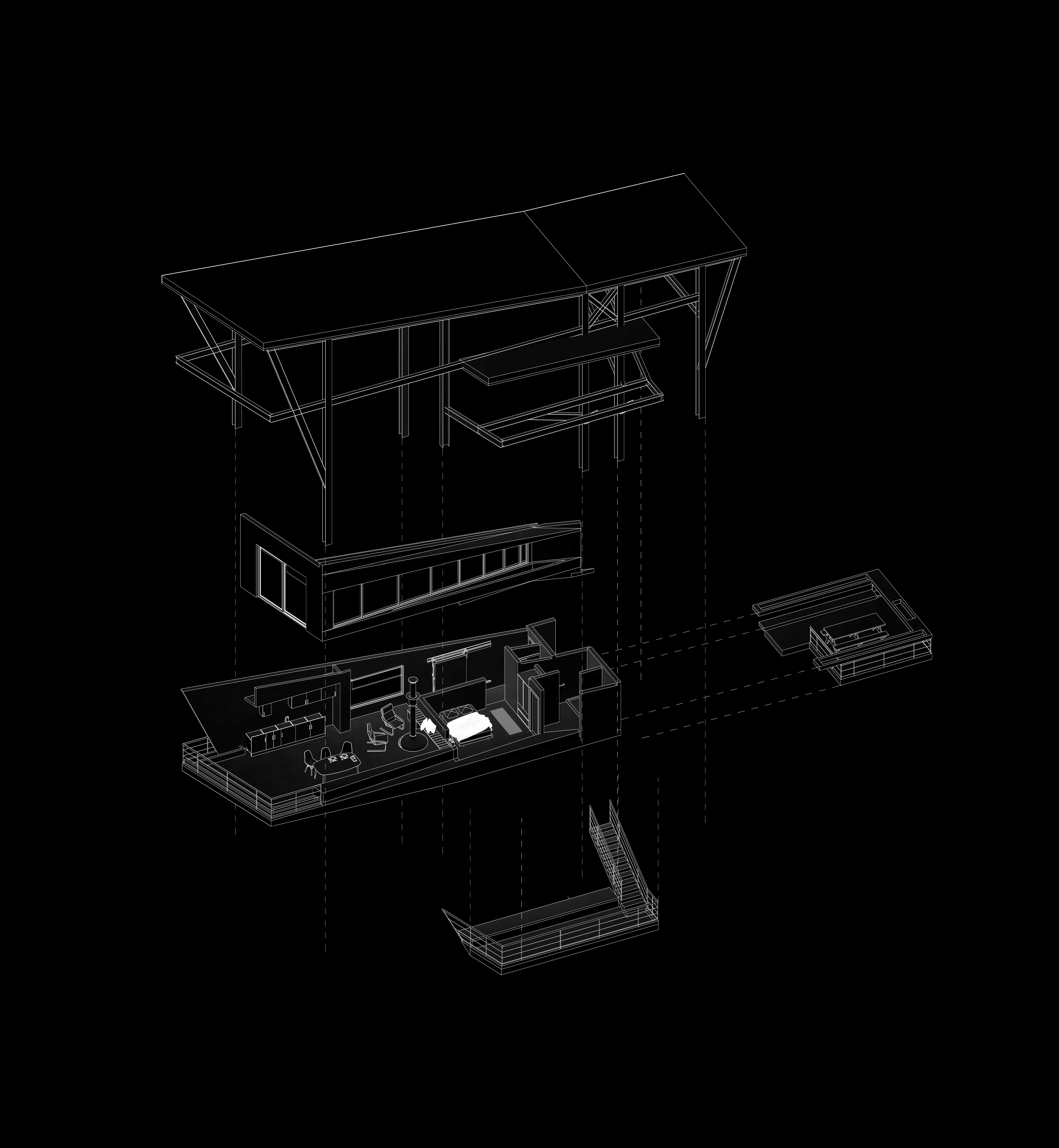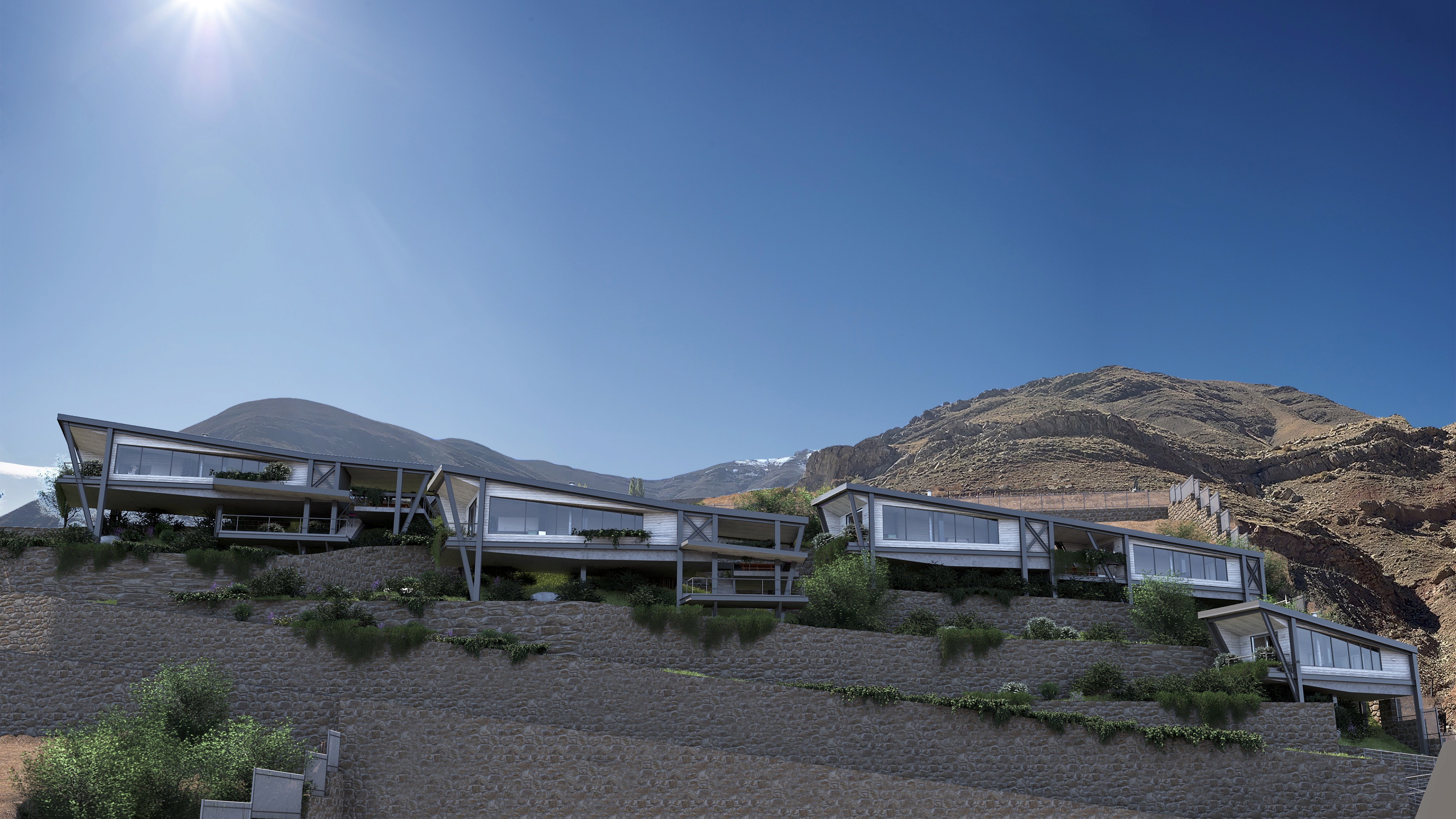 The cabins have been arranged to maximize the exposure of internal and external spaces to northern and specially eastern view through their directional, compact and multifunctional design. The internal and external spaces have been separated through differences in levels which lead to efficient energy use in the interior. The open interior spaces also create a more spacious feeling as the interior areas are very limited. Differences in levels have been dictated by thenatural topography of the plots, thus creating a consistent relationship between the spatial arrangement and site characteristics.