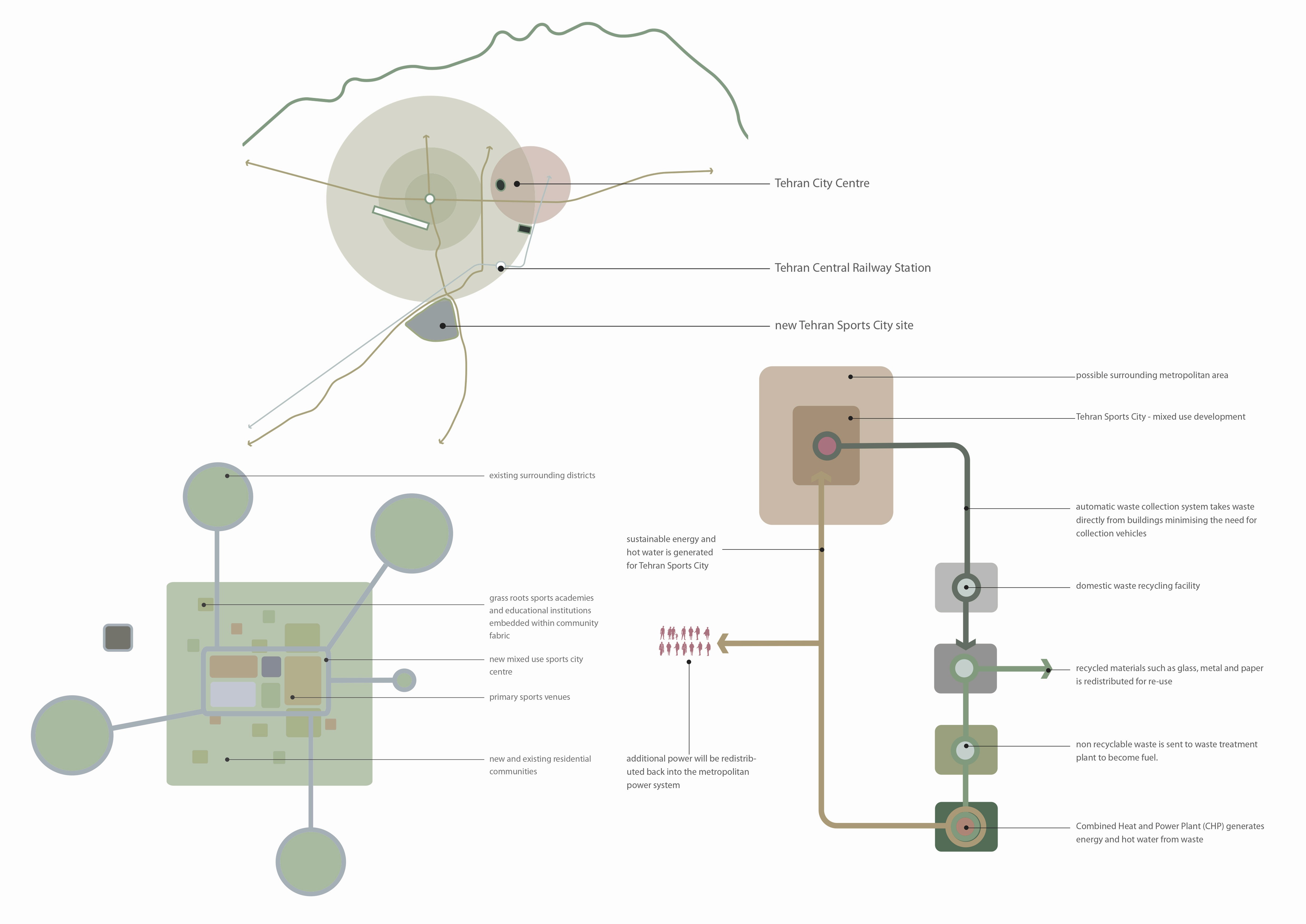 Beyond primary and secondary sports venues Tehran's Sports City has significant capacity for residential, offices, hotel and retail development while also incorporating space for cultural and religious uses.A new ‘city centre’ is proposed adjacent to the primary venue complex incorporating a main shopping bazaar, of offices and a range of hotel and tourism facilities of all standards.In terms of infrastructure it is also proposed that a new railway station linked to central Tehran can be developed in conjunction with a series of multi level carparks and local transport inter- changes. A new facility for converting domestic waste to power is also proposed as a means for providing the city with sustain- able energy.
